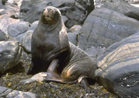 | The females give birth a day or two after arrival and mate about a week later. Their pup is born with a chocolate brown coat which it moults at 4-6 months to be replaced by the adult coat which is dark brown apart from an area of blond fur on the head for males and silver-grey/brown on the back and creamy yellow underneath for females. About 10 days after the pup is born its mother starts going to sea to feed, spending about 2 days at sea and about 1.5 days back ashore, until the pup is weaned. Research suggests that the females feed in relatively shallow nearshore waters 20-30km offshore but probably also make some use of deeper offshore waters. The female nurses its pup for 15-18 months but some pups can be nursed for up to 23 months by the quarter of females who do not pup each breeding season. There is quite a high mortality of pups at the breeding grounds due to aggression by both male and female adults. |