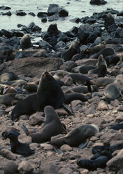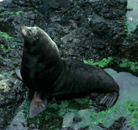 | Lifestyle The Guadalupe fur seal is one of the least-studied of all the fur seal species, due partly to its geographical isolation. However it is known that Guadalupe fur seals breed at rocky sites or in caves on the eastern coast of Isla de Guadalupe, adult males fighting to form territories where there will be an average of 4, but up to 12, females. The females start arriving at the breeding sites in June and give birth to a pup within a few days of their arrival. Pups are born from early June to early August with a black coat, similar to the adult coat which is dark brown to black with light tan hairs on the back of the neck. About 7-8 days after the birth of her pup the mother mates and then leaves to feed at sea. This begins a cycle, lasting about 8-9 months, where she will spend an average of 9-13 days at sea before returning to land to nurse her pup for an average of 5-6 days. These feeding and nursing durations are long compared to other eared seals. |