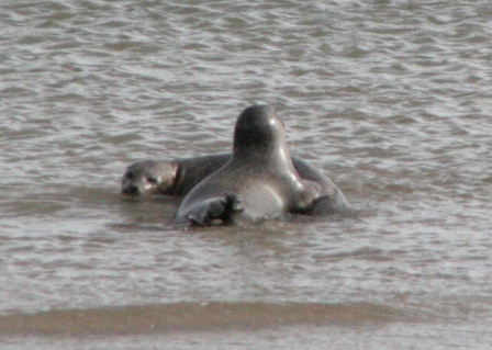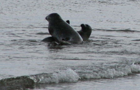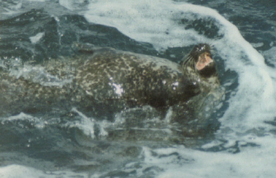 Watch a Sable Island harbour seal fitted with a 'crittercam' foraging on sandeels La Jolla Friends of the Seals video explaining the origins of the seals and the controversy Video explaining the controversy at La Jolla Video of harbour seal colony at La Jolla beach (undisturbed) Video of small harbour seal colony on a beach at Fitzgerald Marine Reserve. Note the greater social activity of seals at the water's edge Video of harbour seal birth at La Jolla (1). The pup is born at the water's edge. The video shows nosing contacts by the mother just after birth, the pup's high activity level and ability to swim immediately after birth, the mother's chaperoning behaviour, and the hovering of a gull anticipating the afterbirth. Judging by the soundtrack, the human audience may have been rather too close and too loud in its cheering at the moment of birth. Video of a harbour seal birth at La Jolla (2). This time the pup was born on a dry part of the beach. The amniotic sac is clearly seen. Again, a gull is waitng for the afterbirth. Video of older harbour seal pup activity at water's edge (probably also at La Jolla). |